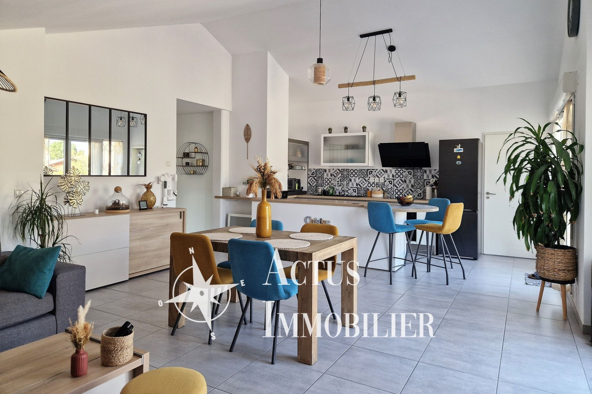 Une grande pièce de vie avec cuisine américaine donne accès à la terrasse via de larges portes fenêtres.